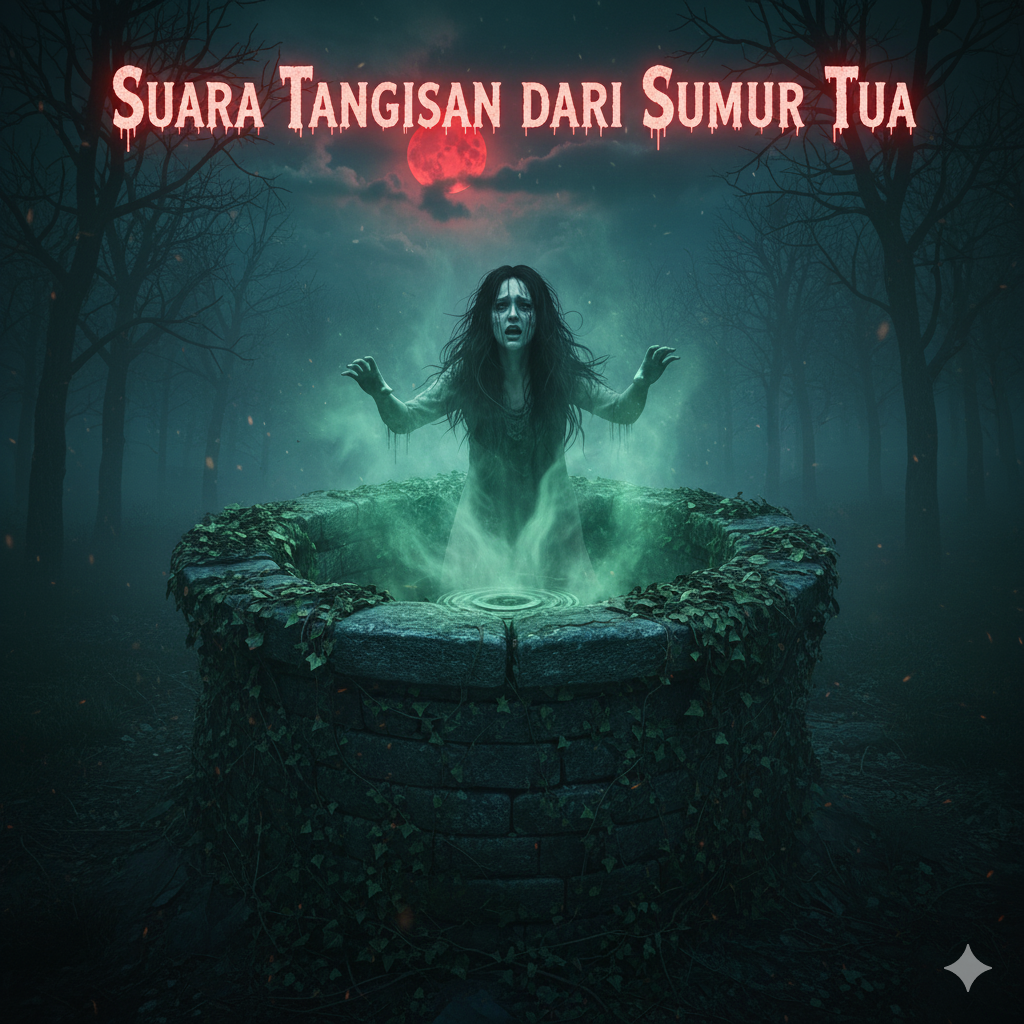 Dengan senter kecil di tangannya, Rina melangkah ke halaman belakang. Suara tangisan itu semakin jelas. Di balik semak belukar, berdiri sebuah sumur tua dengan dinding batu berlumut. Bibir sumur ditutupi kayu lapuk, tapi jelas dari situlah suara itu berasal.